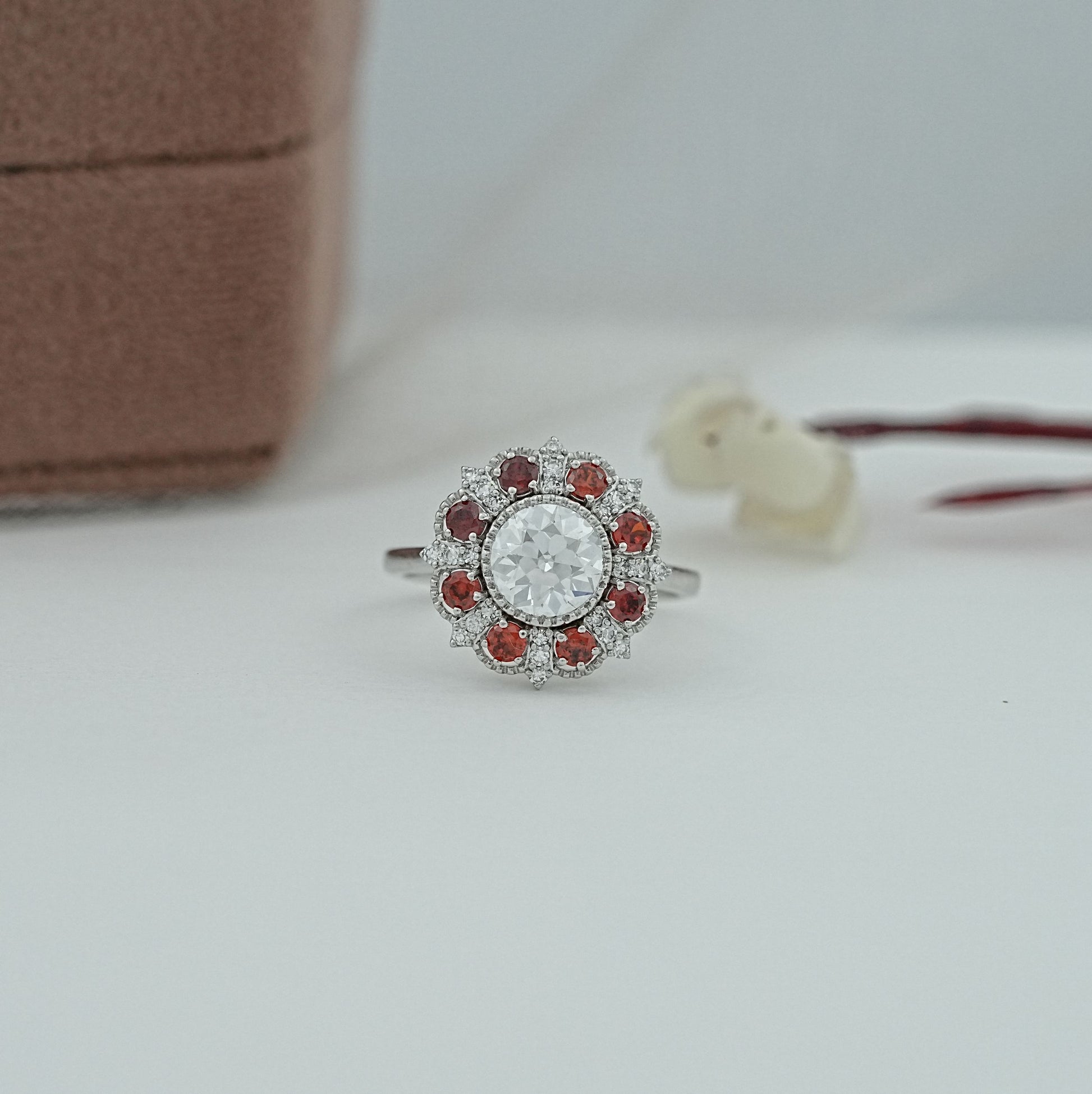 Old European Round Cut And Red Gemstone Halo Cluster Ring