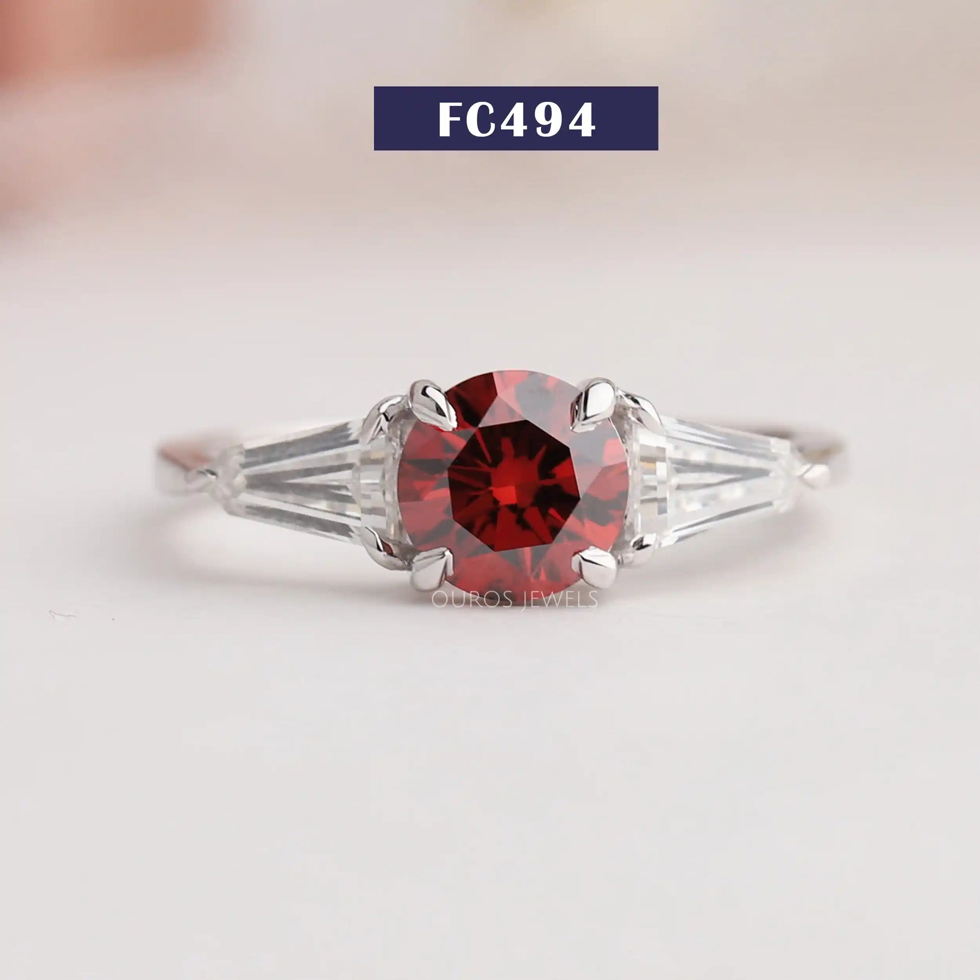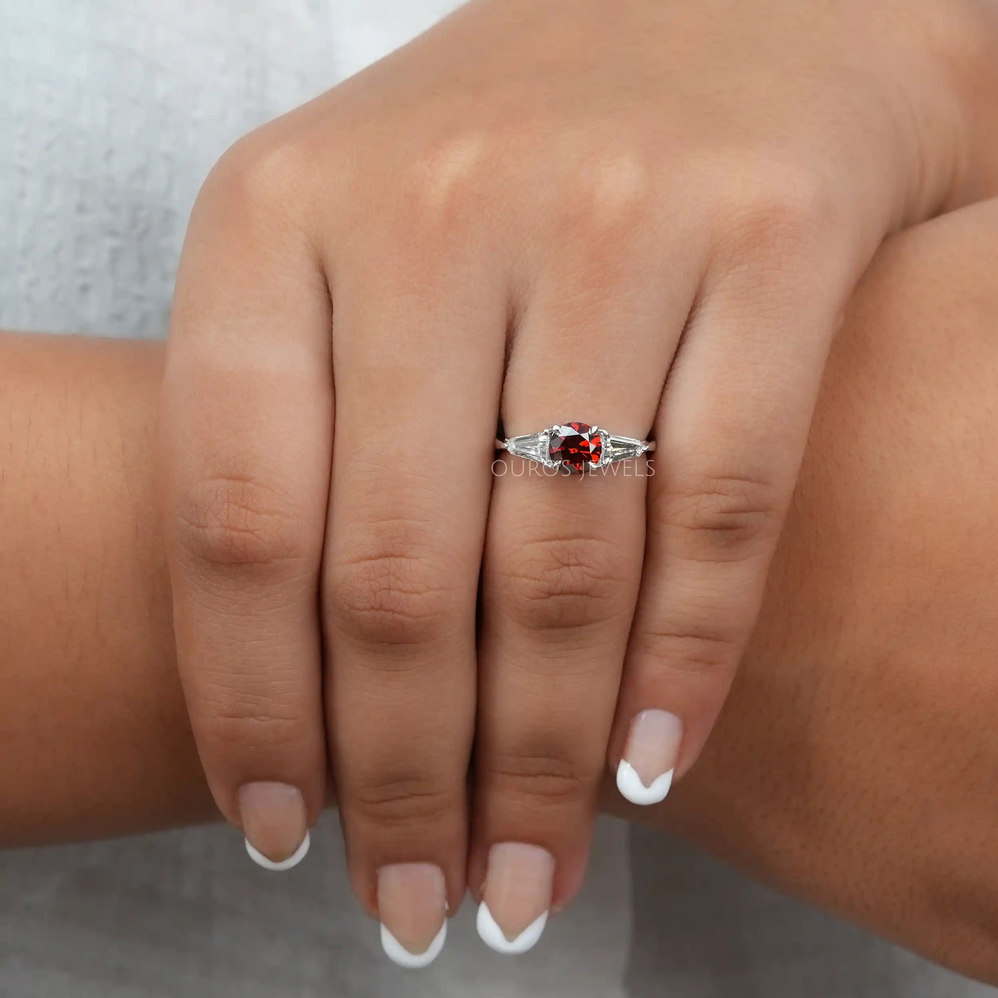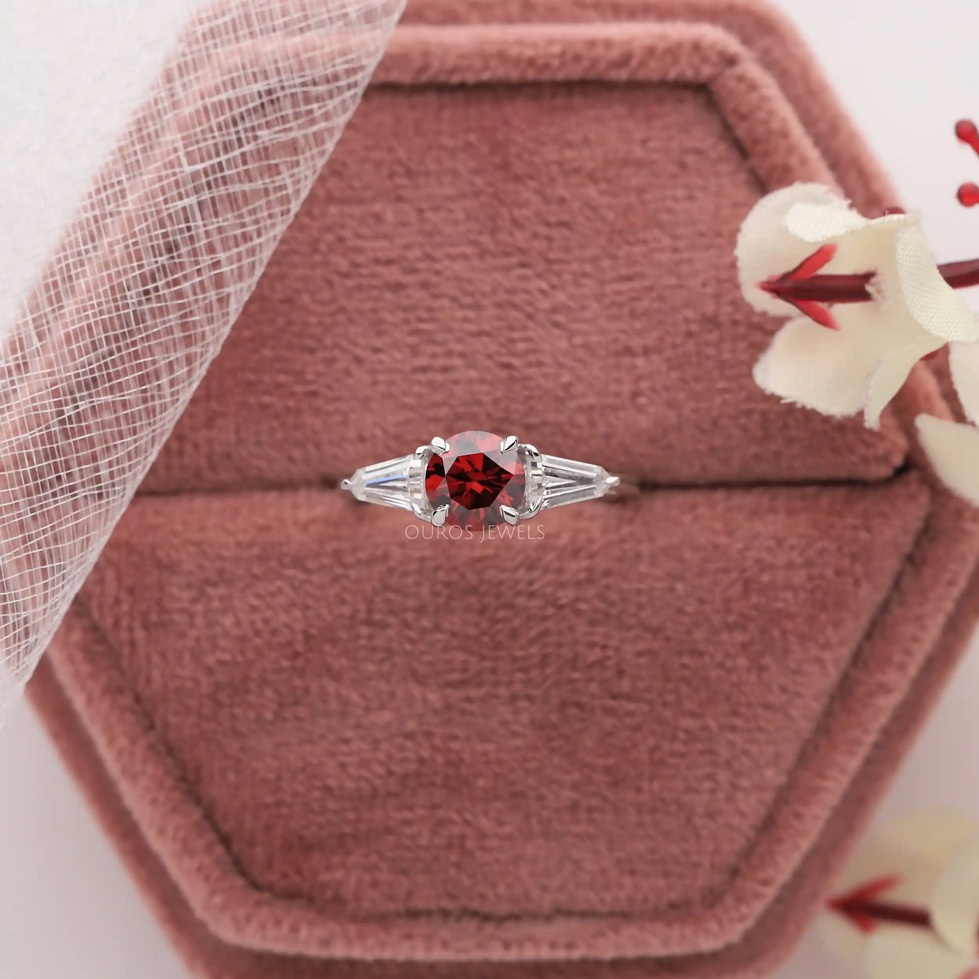 Red Round Cut Three Stone Ring
