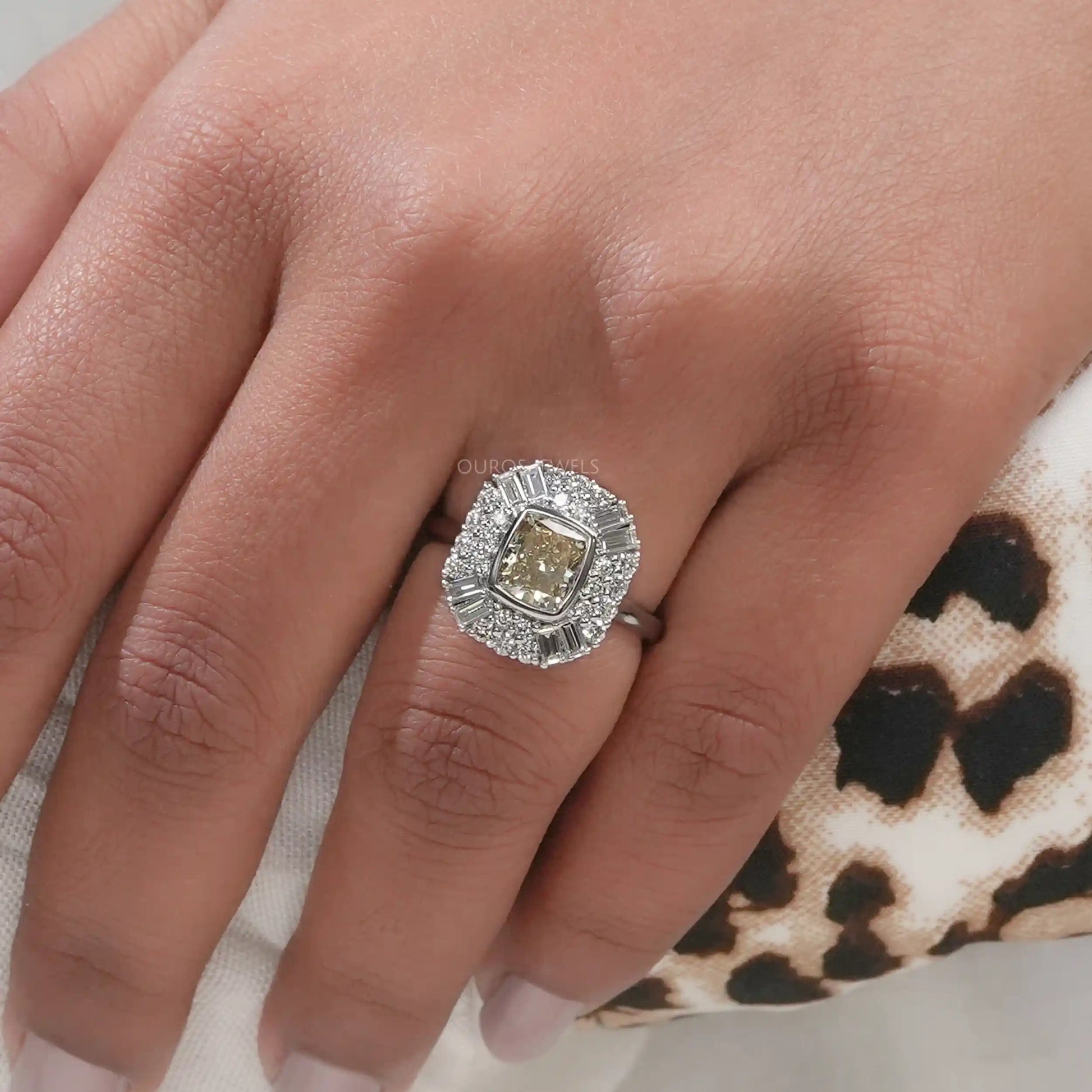 Yellow Cushion Cut Baguette Halo Engagement Ring